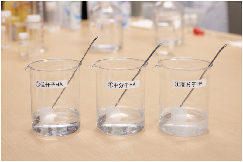 紧接着来到实验室,乐敦提供我们简单的玻尿酸製作体验,分别由大中小玻尿酸分子调配出浓稠度不同的保养品,我们问到,大中小分子对于保养肌肤的差别是什么?分子愈小愈好吗?RVK 基础研究部皮肤系统研究组经理 佐藤康成表示,玻尿酸其实有很多的种类,不管是大分子还是小分子都各有不同作用,对肌肤都非常重要,因为大分子可以锁水;小分子可以更深层的渗透到肌肤内部,在每次的实验中可以观察到,玻尿酸大分子对细胞的表皮表层有非常多好的作用;小分子则可防止紫外线对肌肤的伤害,因此对于消费者来说,可能就是要去选择适合自己肌肤需求的产品了。