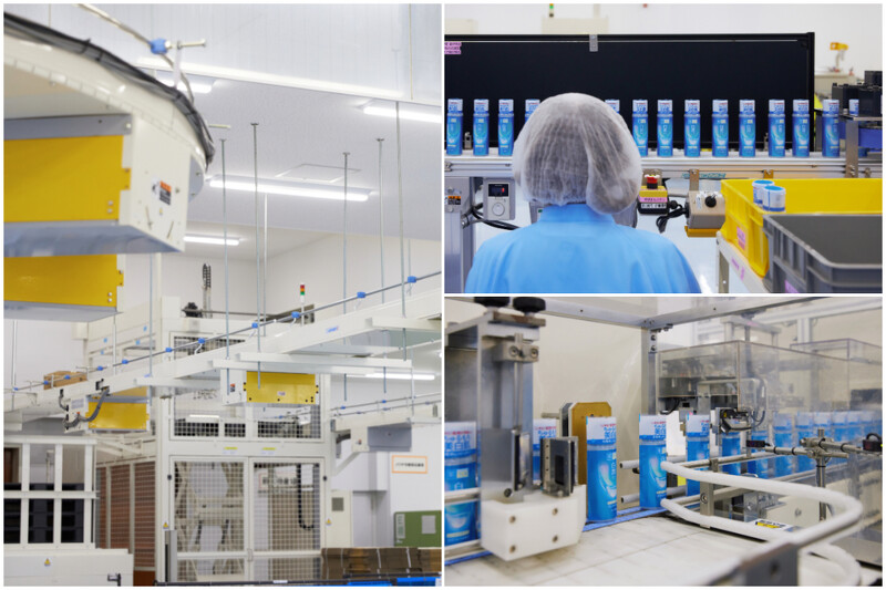 隔天我们驱车前往乐敦位于上野的工厂,从一踏进工厂就必须经过层层的关卡,包括换上无菌实验衣、戴上防尘帽和手套,再集体进入消毒室进行全身性的消毒后才能进入工厂内部,工厂内部的路线规划有”人行道”和机器人走的轨道,我们须遵循着路线行进,在一间间厂房里,看见机械手臂正忙着加工产品,末端则有专业人员进行对产品的检测,一整套井然有序又有效率的生产线,让我们见识到日本职人精神的完美体现。